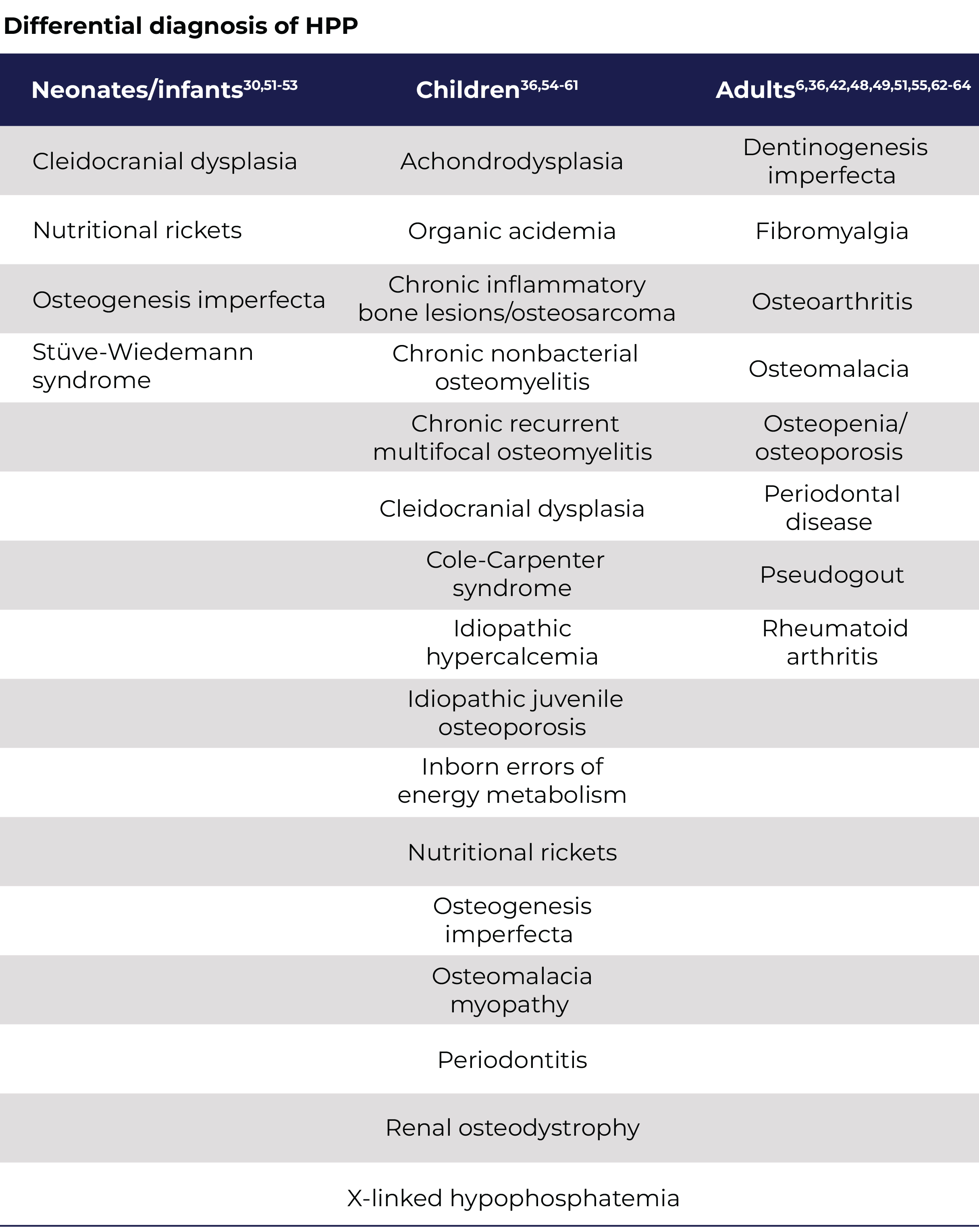 16. Rush E, Brandi ML, Khan A et al. Proposed diagnostic criteria for the diagnosis of hypophosphatasia in children and adolescents: results from the HPP International Working Group. Osteroporos Int. 2024; 35: 1-10.