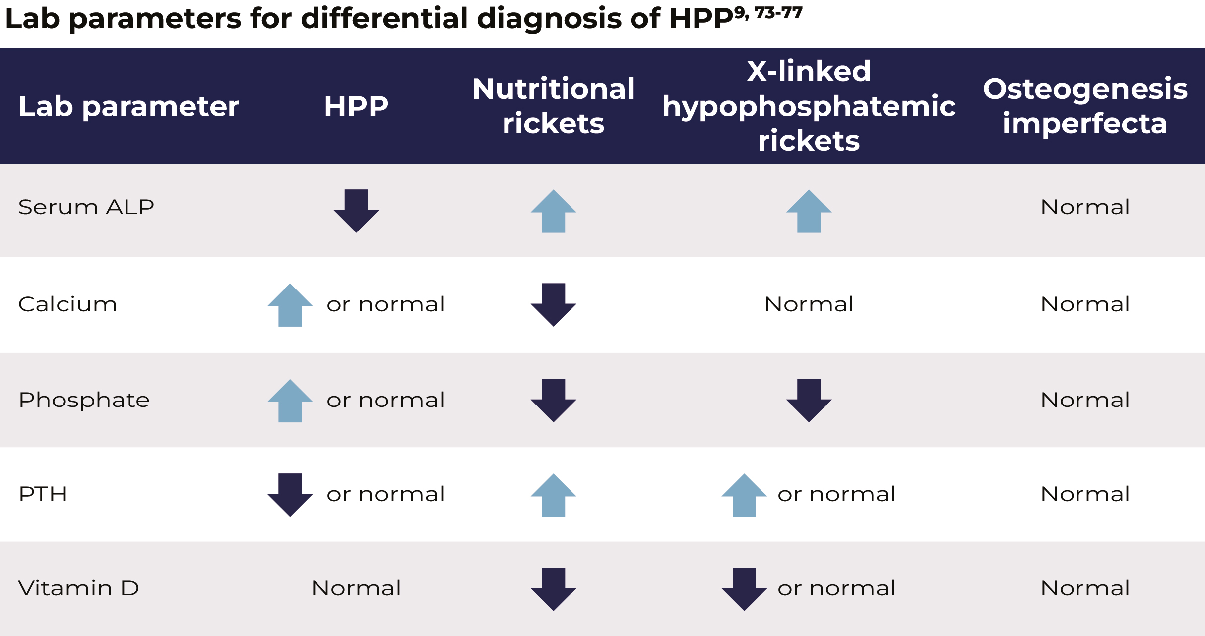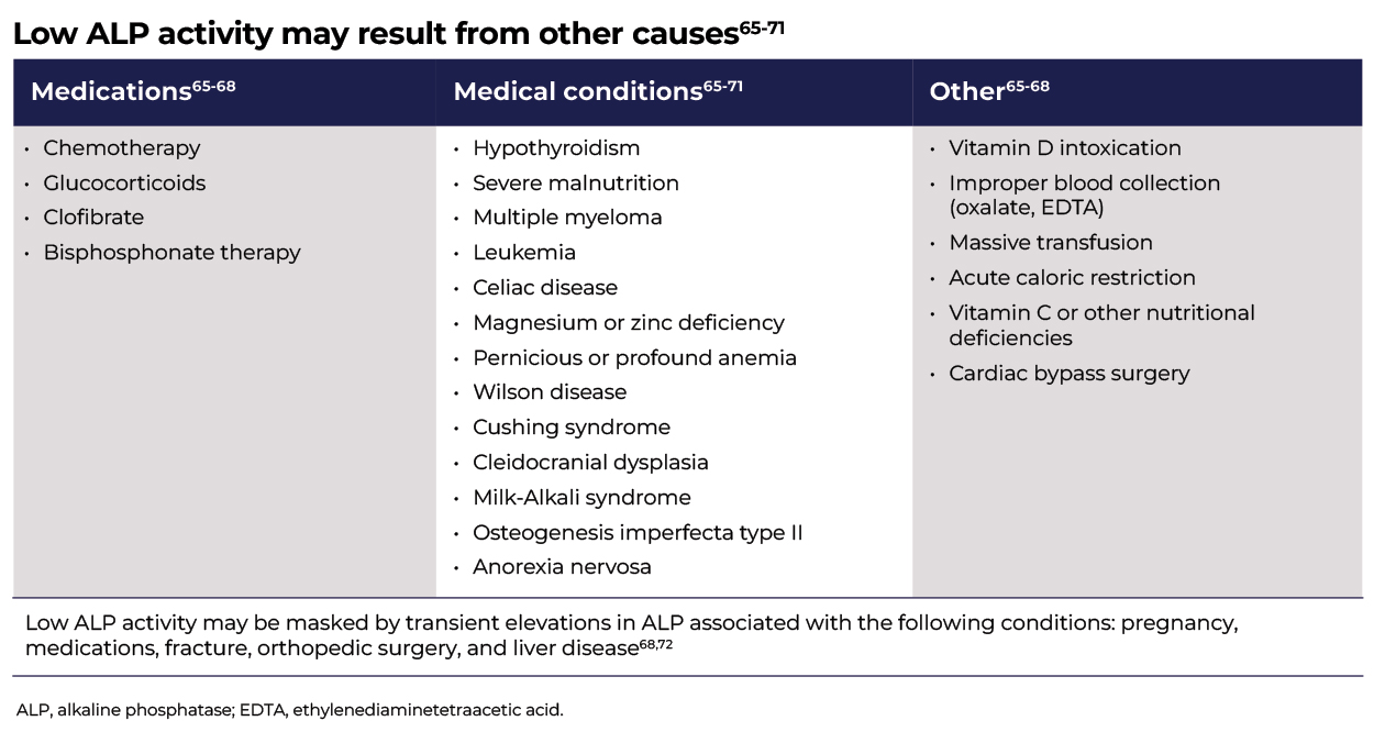 Differences in laboratory parameters are important when considering a differential diagnosis. Importantly, a low age- and sex-adjusted ALP activity level can assist in differentiating HPP from other skeletal-related disorders.6,9-12,14,15,32